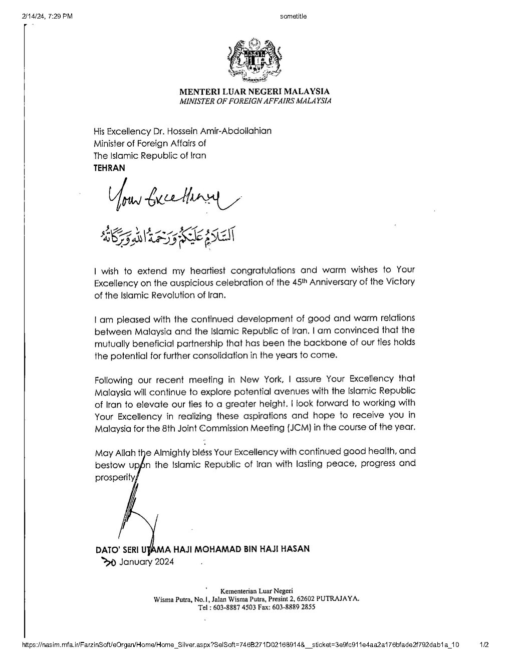On the occation of 45th anniversary of the victory of the Islamic Revolution of Iran, Dato Sery Utama Haji Mohamad Bin Haji Hassan minister of Foreign affairs of Malaysia sent a congratulatory message to his Iranian counterpart Dr. Hossein Amir-Abdollahian.