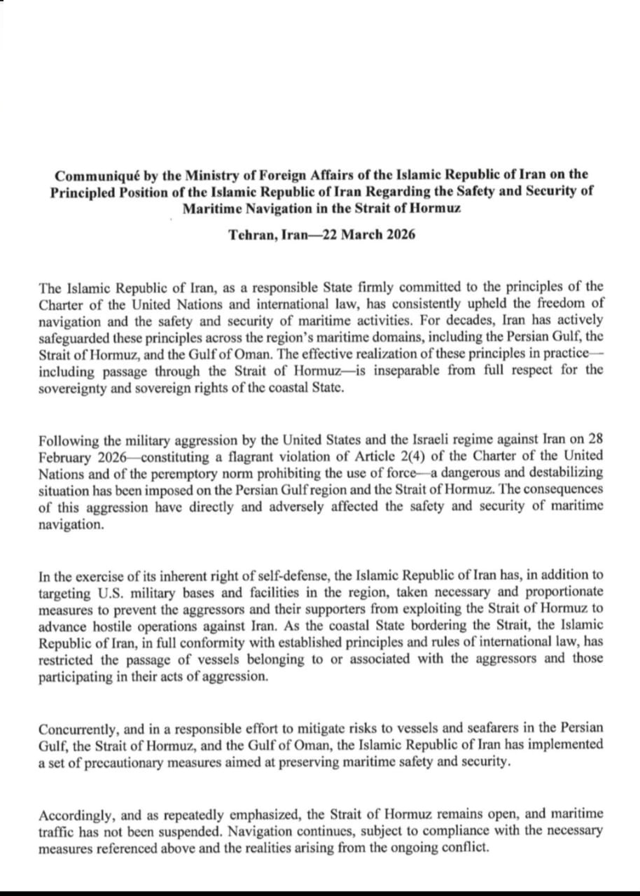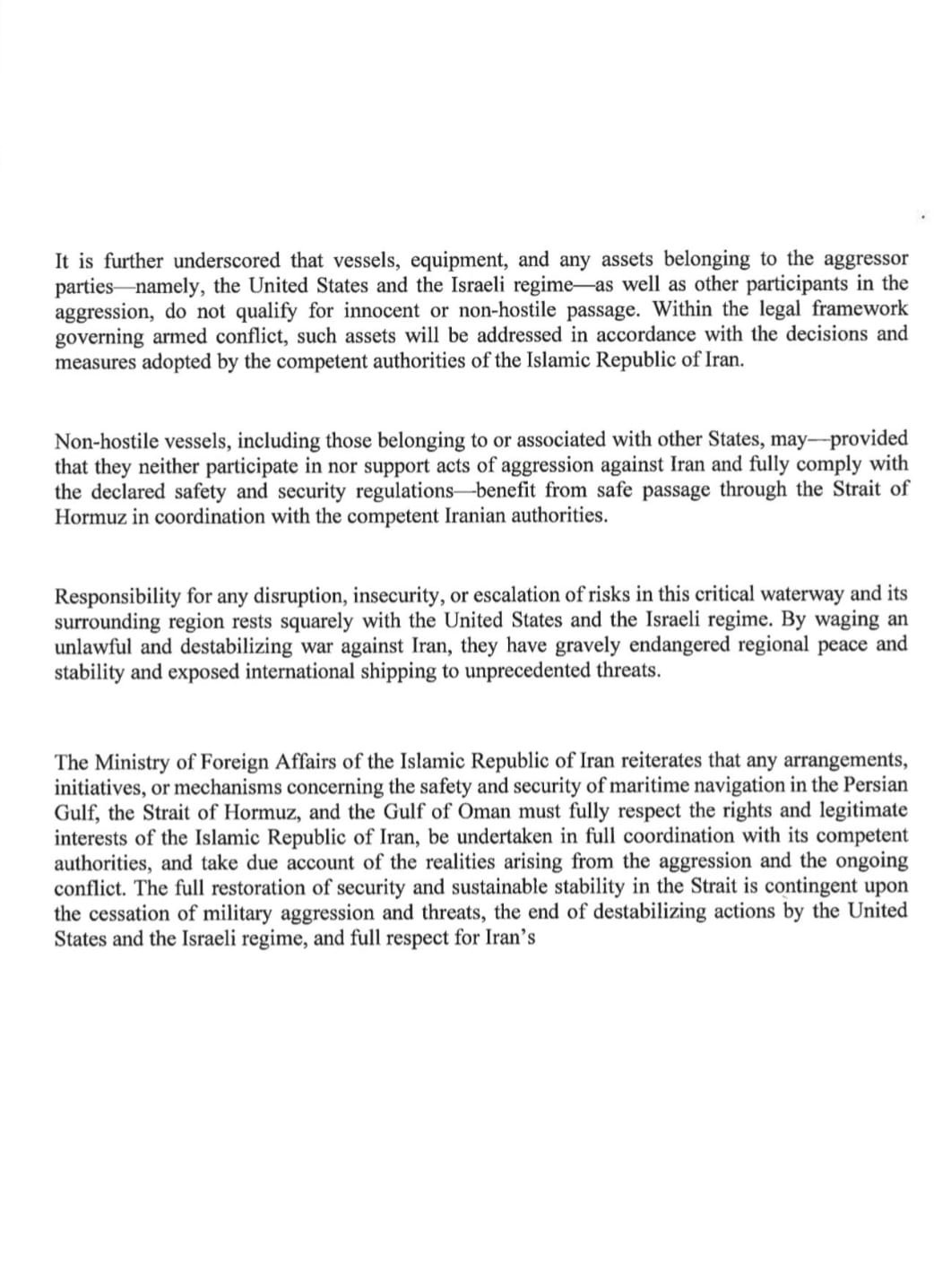 on the Principled Position of the Islamic Republic of Iran Regarding the Safety and Security of Maritime Navigation in the Strait of Hormuz