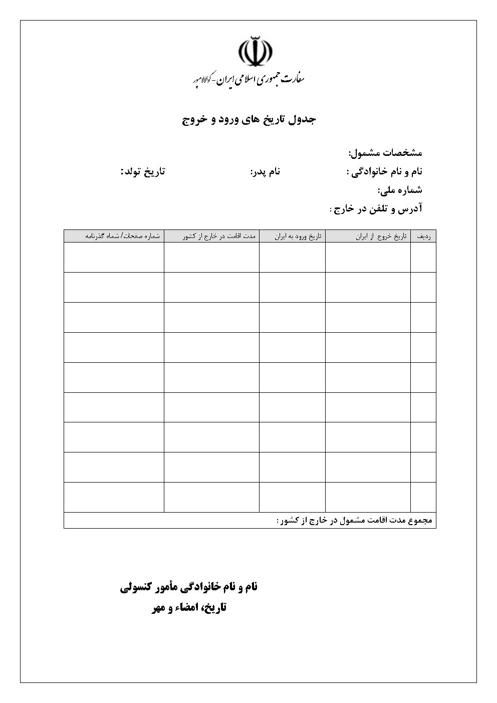- استعلام از نظام وظیفه جهت مجوز مهر خروج مشمولین (۱۰روز کاری در ایران) - فرم مربوط تکمیل گردد و به کنسولگری مراجعه فرمایید