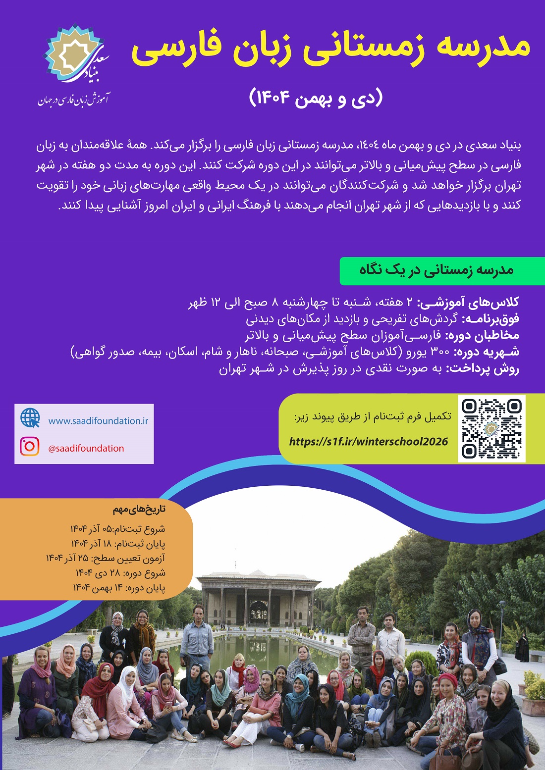 دوره زمستانی آموزش زبان فارسی برای علاقمندان در دی و بهمن ۱۴۰۴ در تهران توسط بنیاد سعدی برگزار میشود. اطلاعات تکمیلی در فراخوان قابل دسترسی است.